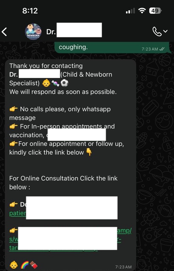These are the basic automated responses triggered instantly after a message. For instance, when I contact my child’s pediatrician (who uses WhatsApp business), an automated reply always follows before he actually replies.