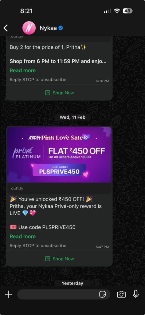 Here is an example of a conversational automated message from beauty and fashion brand, Nykka. If you notice, these are not promotional in nature (although the end goal is same) but are more personalized and tailored to user preferences.