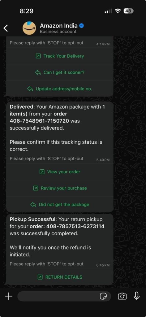 Delivery status is automatically shared when their package is out for delivery, which are notifications triggered based on delivery partners’ updates. Best example here would be Amazon.