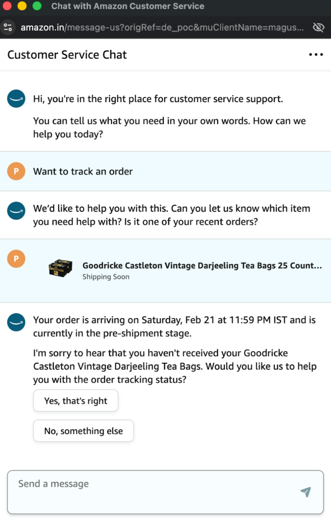 Workflow automation are structured conversations guiding a customer to a goal. For instance, Amazon’s chatbot helping with order details, delivery tracking, options to prepone delivery, discuss payment options, etc. It is instant, and has all the right options to select incase you want information of an order already placed.